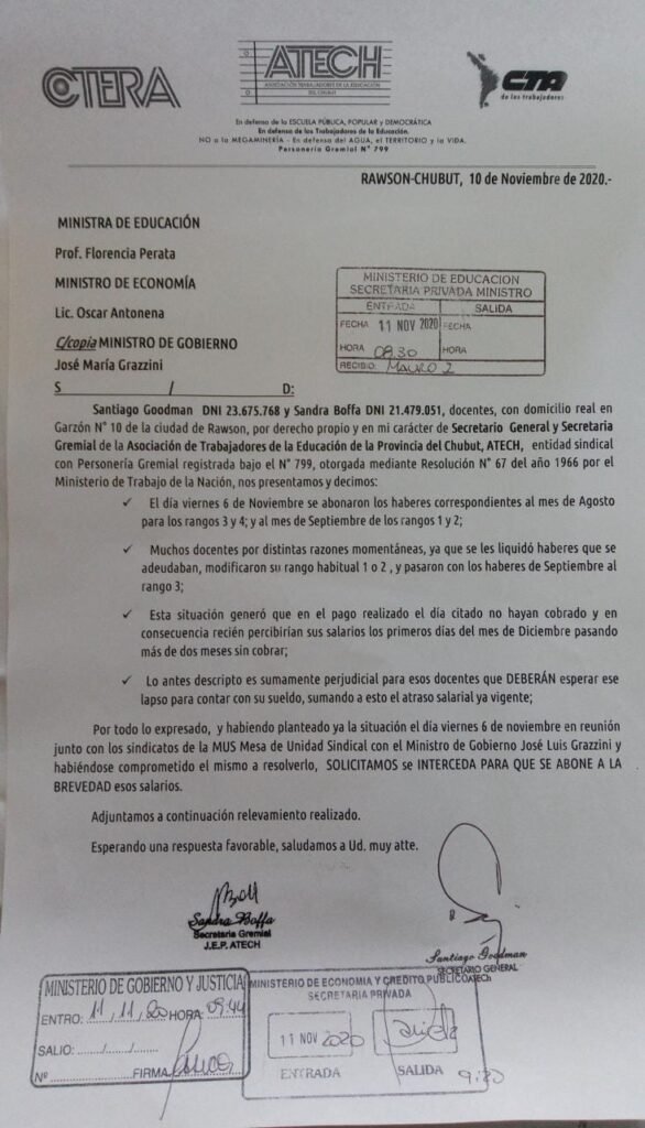 Solicitud presentada a la Ministra de Educación y Ministro de Economía, por cambio de rango de algunxs docentes en haberes de septiembre, solo por eso mes, y que en consecuencia en el último pago de salarios no cobraron.