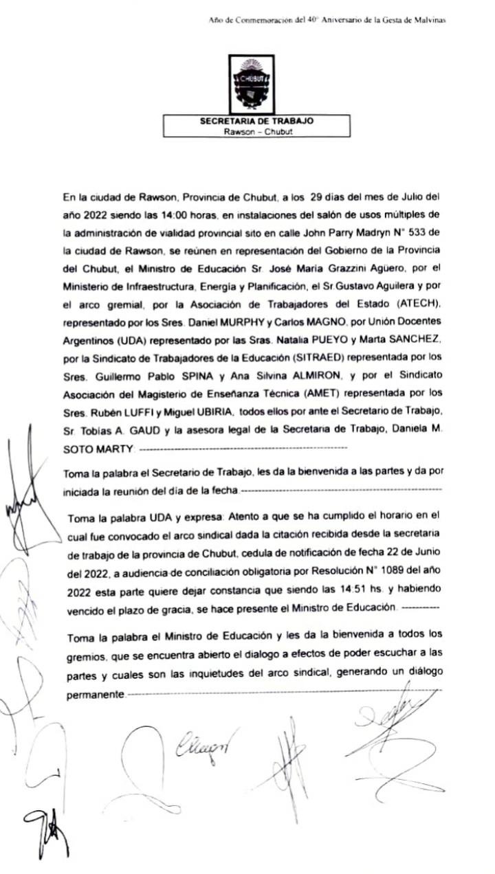 Dejamos constancia del acta de la reunión realizada este viernes 29 de julio de 2022 en la ciudad de Rawson.