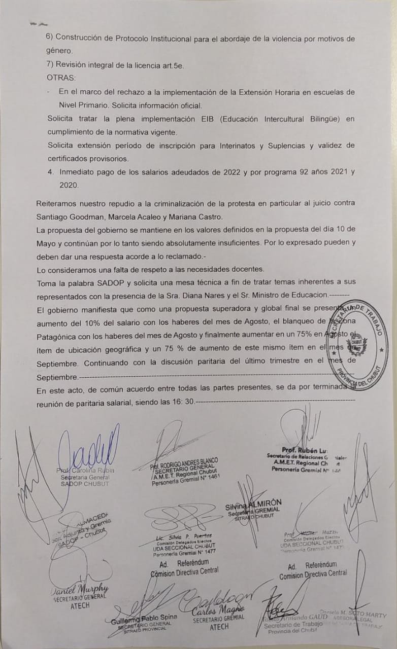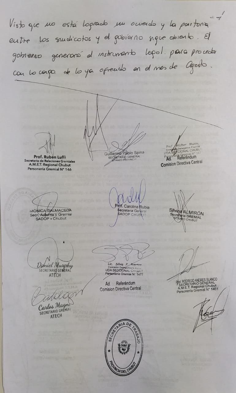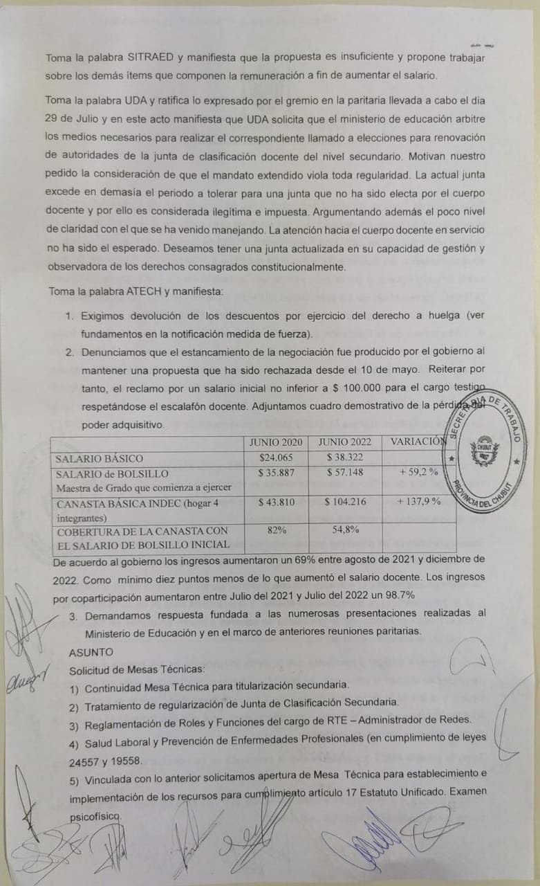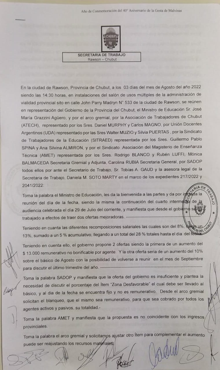 Dejamos constancia del acta de la reunión paritaria que sea realizó este miércoles 3 de agosto del 2022 en el edificio de Vialidad Provincial en la ciudad de Rawson.