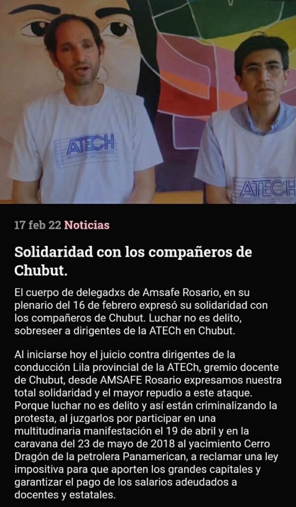 El cuerpo de delegadxs de AMSAFE Rosario expresó su solidaridad con los compañeros de Chubut. «Luchar no es delito, sobreseer a dirigentes de la ATECh en Chubut», expresaron.