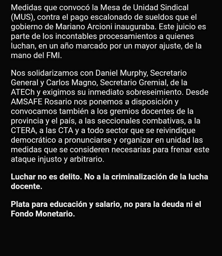 Nos solidarizamos con Daniel Murphy, Secretario General y Carlos Magno, Secretario Gremial, de la ATECh y exigimos su inmediato sobreseimiento. Desde AMSAFE Rosario nos ponemos a disposición y convocamos también a los gremios docentes de la provincia y el país, a las seccionales combativas, a la CTERA, a las CTA y a todo sector que se reivindique democrático a pronunciarse y organizar en unidad las medidas que se consideren necesarias para frenar este ataque injusto y arbitrario.
