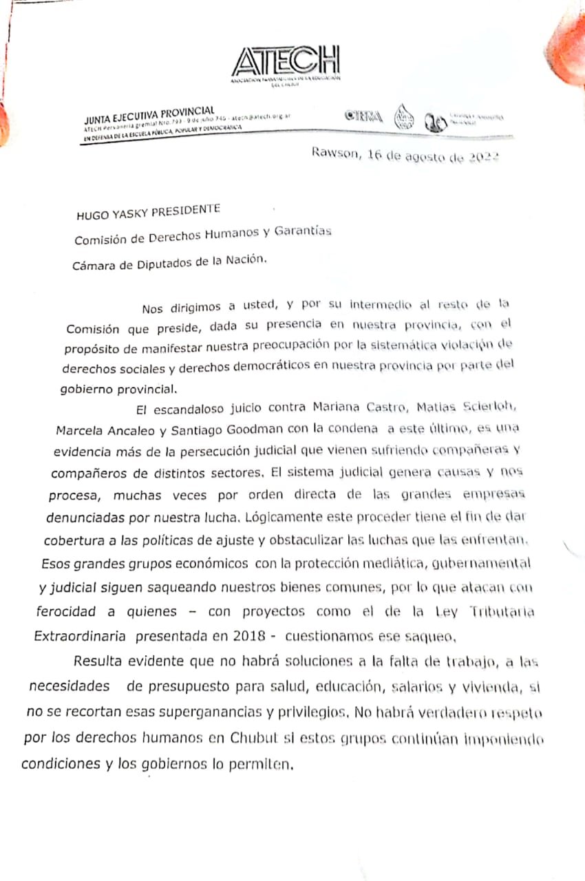 ATECH presentó solicitud a Hugo Yasky, presidente de la Comisión de DDHH del Congreso de la Nación.