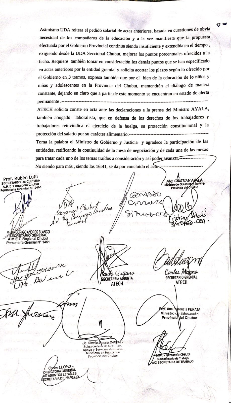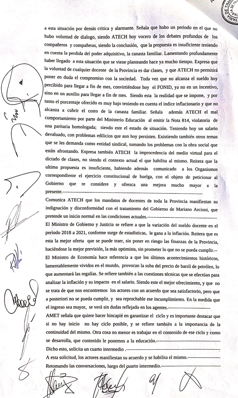 El secretario gremial, Carlos Magno explicó “en la nueva reunión con el Gobierno no hubo ninguna nueva propuesta salarial. Habiendo sido calificada como INSUFICIENTE la última- por centenares de mandatos- la ATECh ratifica la declaración de paro por 72 horas y ante el llamado a conciliación obligatoria, contesta que la rechazará, ratificando todas las medidas de acción que están programadas”.