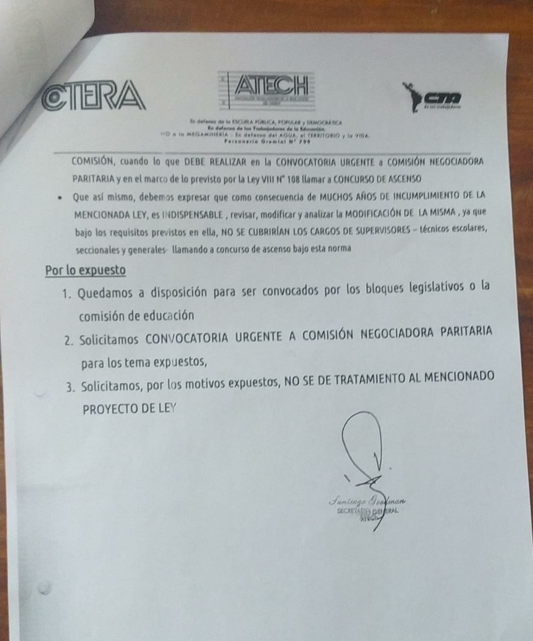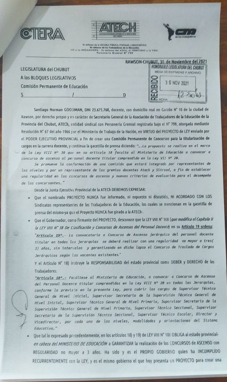 Oportunamente, el 30 de noviembre de 2021, tras el sorpresivo anuncio del proyecto de ley, ATECH ingresó a la Legislatura la presentación que solicita al Poder Legislativo una reunión para ampliar los fundamentos del rechazo a la iniciativa del gobernador Arcioni.