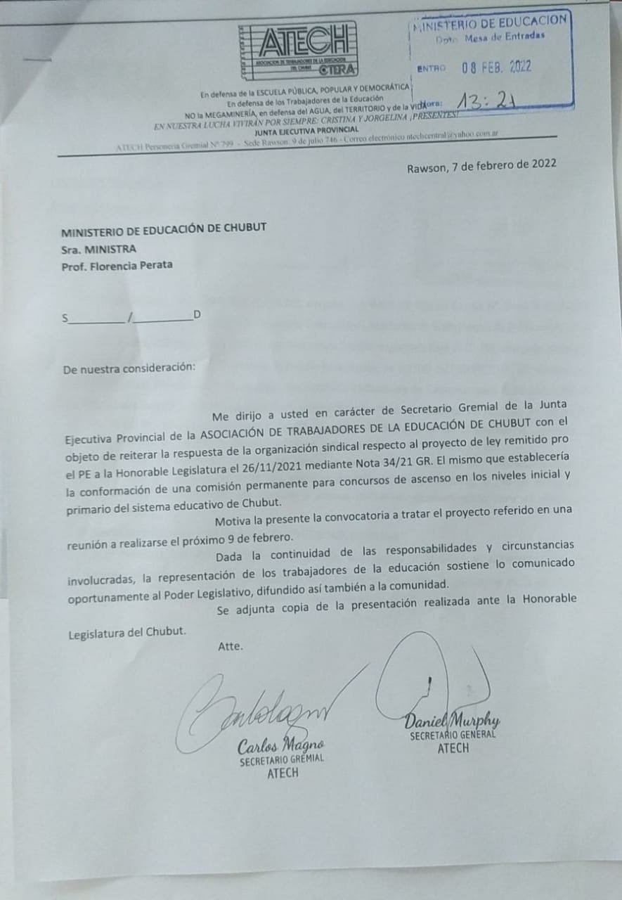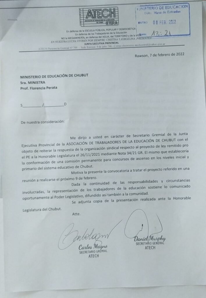 Este martes 8 de febrero la ASOCIACIÓN DE TRABAJADORES DE LA EDUCACIÓN DE CHUBUT (ATECh) comunicó a la ministra de educación, Florencia Perata, que la organización sindical mantiene la opinión comunicada el 30 de noviembre de 2021 a la Honorable Legislatura.