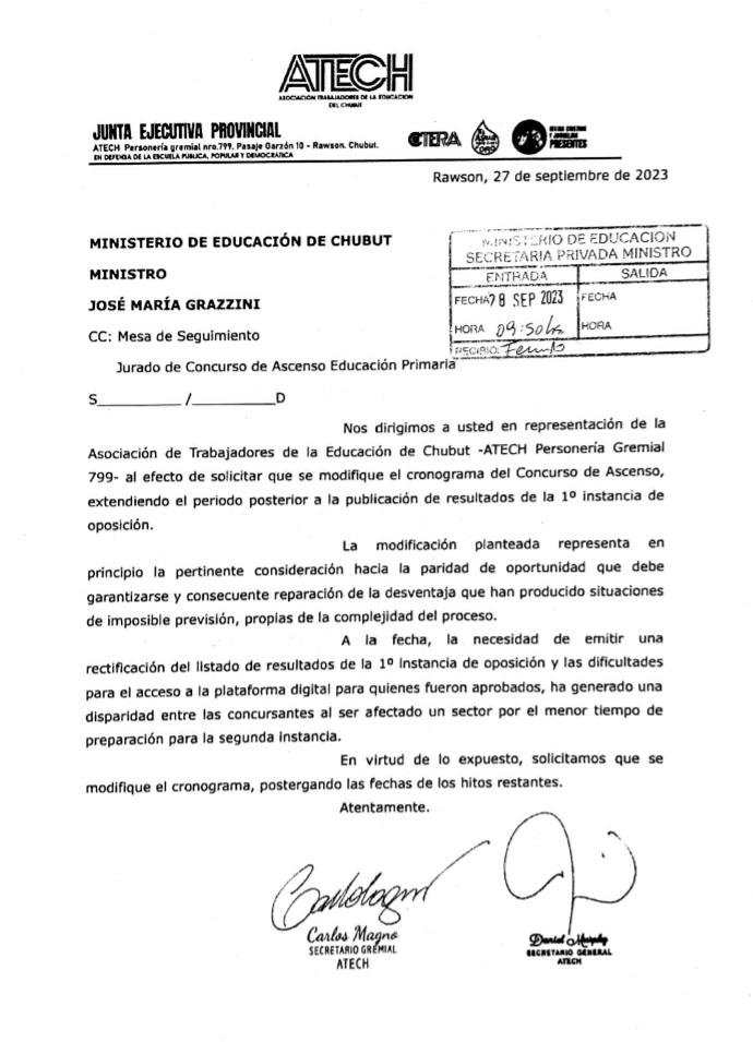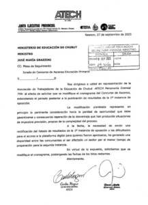 ATECH realizó una presentación al Ministerio de Educación, solicitando que se modifique el cronograma del Concurso de Ascenso, extendiendo el periodo posterior a la publicación de resultados de la 1° Instancia de oposición.