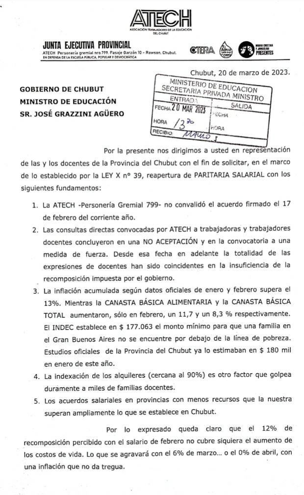 Este lunes 20 de marzo del 2023, ATECh, envió al Ministro de Educación una nueva solicitud exigiendo la reapertura de PARITARIA SALARIAL.