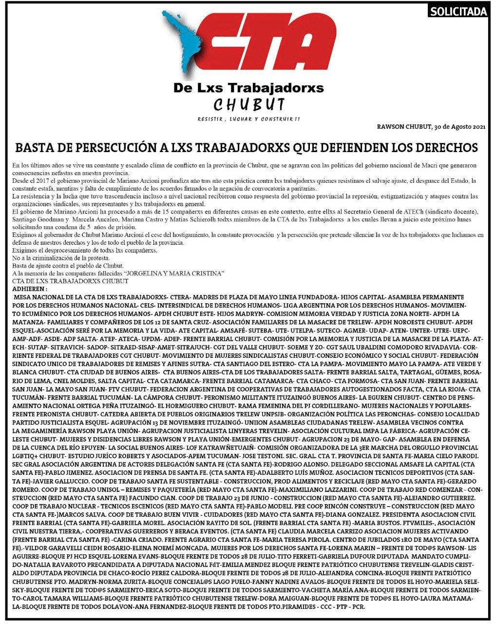 MESA NACIONAL DE LA CTA DE LXS TRABAJADORXS- CTERA- MADRES DE PLAZA DE MAYO LINEA FUNDADORA- HIJOS CAPITAL- ASAMBLEA PERMANENTE POR LOS DERECHOS HUMANOS NACIONAL- CELS- INTERSINDICAL DE DERECHOS HUMANOS- LIGA ARGENTINA POR LOS DERECHOS HUMANOS- MOVIMIENTO ECUMÉNICO POR LOS DERECHOS HUMANOS- APDH CHUBUT ESTE- HIJOS MADRYN- COMISION MEMORIA VERDAD Y JUSTICIA ZONA NORTE- APDH LA MATANZA- FAMILIARES Y COMPAÑEROS DE LOS 12 DE SANTA CRUZ- ASOCIACIÓN FAMILIARES DE LA MASACRE DE TRELEW- APDH NOROESTE CHUBUT- APDH ESQUEL-ASOCIACIÓN SERÉ POR LA MEMORIA Y LA VIDA- ATE CAPITAL- AMSAFÉ- SUTEBA- UTE- UTELPA- SUTECO- AGMER- UDAP- ATEN- UNTER- UTRE- UEPC- AMP-ADF- ASDE- ADP SALTA- ATEP- ATECA- UPDM- ADEP- FRENTE BARRIAL CHUBUT- COMISIÓN POR LA MEMORIA Y JUSTICIA DE LA MASACRE DE LA PLATA- ATECH- SUTAP- SITRAVICH- SADOP- SITRAED-SISAP-AMET-SITRAJUCH- CGT DEL VALLE CHUBUT- SOEME Y ZO- CGT SAUL UBALDINI COMODORO RIVADAVIA- CORRIENTE FEDERAL DE TRABAJADORES CGT CHUBUT- MOVIMIENTO DE MUJERES SINDICALISTAS CHUBUT-CONSEJO ECONÓMICO Y SOCIAL CHUBUT- FEDERACIÓN SINDICATO UNICO DE TRABAJADORES DE REMISES Y AFINES SUTRA- CTA SANTIAGO DEL ESTERO- CTA LA PAMPA- MOVIMIENTO MAYO LA PAMPA- ATE VERDE Y BLANCA CHUBUT- CTA CIUDAD DE BUENOS AIRES- CTA BUENOS AIRES-CTA DE LOS TRABAJADORES SALTA- FRENTE BARRIAL SALTA, TARTAGAL, GÜEMES, ROSARIO DE LEMA, CNEL MOLDES, SALTA CAPITAL- CTA CATAMARCA- FRENTE BARRIAL CATAMARCA- CTA CHACO- CTA FORMOSA- CTA SAN JUAN- FRENTE BARRIAL SAN JUAN- LA MAYO SAN JUAN- FTV CHUBUT- FEDERACION ARGENTINA DE COOPERATIVAS DE TRABAJADORES AUTOGESTIONADOS FACTA, CTA LA RIOJA- CTA TUCUMÁN- FRENTE BARRIAL TUCUMÁN- LA CÁMPORA CHUBUT- PERONISMO MILITANTE ITUZAINGÓ BUENOS AIRES- LA EGUREN CHUBUT- CENTRO DE PENSAMIENTO NACIONAL ORTEGA PEÑA ITUZAINGÓ- EL HORMIGUERO CHUBUT- RAMA FEMENINA DEL PJ CORDILLERANO- MUJERES NACIONALES Y POPULARES- FRENTE PERONISTA CHUBUT- CATEDRA ABIERTA DE PUEBLOS ORIGINARIOS TRELEW UNPSJB- ORGANIZACIÓN POLÍTICA LAS PERONCHAS- CONSEJO LOCALIDAD PARTIDO JUSTICIALISTA ESQUEL- AGRUPACIÓN 13 DE NOVIEMBRE ITUZAINGÓ- UNIION ASAMBLEAS CIUDADANAS TRELEW- ASAMBLEA VECINOS CONTRA LA MEGAMINERÍA RAWSON PLAYA UNIÓN- AGRUPACION JUSTICIALISTA LINYERAS TREVELIN- ASOCIACIÓN CULTURAL IMPA LA FÁBRICA- AGRUPACIÓN CELESTE CHUBUT- MUJERES Y DISIDENCIAS LIBRES RAWSON Y PLAYA UNIÓN-EMERGENTES CHUBUT- AGRUPACION 23 DE MAYO- GAP- ASAMBLEA EN DEFENSA DE LA CUENCA DEL RÍO EPUYEN- LA SOCIAL BUENOS AIRES- LOF KATRAWÑETUAIÑ- COMISIÓN ORGANIZADORA DE LA 3ER MARCHA DEL ORGULLO PROVINCIAL LGBTIQ+ CHUBUT- ESTUDIO JURÍCO ROBERTS Y ASOCIADOS-APEM TUCUMAN- JOSE TESTONI. SEC. GRAL. CTA T. PROVINCIA DE SANTA FE-MARIA CIELO PARODI. SEC GRAL ASOCIACIÓN ARGENTINA DE ACTORES DELEGACIÓN SANTA FE (CTA SANTA FE)-RODRIGO ALONSO. DELEGADO SECCIONAL AMSAFE LA CAPITAL (CTA SANTA FE)-PABLO JIMENEZ. ASOCIACION DE PRENSA DE SANTA FE. (CTA SANTA FE)-ADALBERTO LUÍS MUÑOZ. ASOCIACION TECNICOS DEPORTIVOS (CTA SANTA FE)-JAVIER GALLUCCIO. COOP DE TRABAJO SANTA FE SUSTENTABLE – CONSTRUCCION, PROD ALIMENTOS Y RECICLAJE (RED MAYO CTA SANTA FE)-GERARDO ROMERO. COOP DE TRABAJO UNISOL – REMISES Y PAQUETERÍA (RED MAYO CTA SANTA FE)-MAXIMILIANO LAZZARINI. COOP DE TRABAJO RED COMENZAR – CONSTRUCCION (RED MAYO CTA SANTA FE) FACUNDO CIAN. COOP DE TRABAJO 23 DE JUNIO – CONSTRUCCION (RED MAYO CTA SANTA FE)-ALEJANDRO GUTIERREZ. COOP DE TRABAJO NUCLEAR – TECNICOS ESCENICOS (RED MAYO CTA SANTA FE)-PABLO MODELI. PRE COOP RINCÓN CONSTRUYE – CONSTRUCCION (RED MAYO CTA SANTA FE-)MARCOS SALVA. COOP DE TRABAJO BUEN VIVIR – CUIDADORES (RED MAYO CTA SANTA FE)-DIANA GONZALEZ. PRESIDENTA ASOCIACION CIVIL FRENTE BARRIAL (CTA SANTA FE)-GABRIELA MOREL. ASOCIACIÓN RAYITO DE SOL. (FRENTE BARRIAL CTA SANTA FE) -MARIA BUSTOS. FTVMILES-, ASOCIACIÓN CIVIL NUESTRA TIERRA,- COOPERATIVAS GUERREROS Y BERACA EVENTOS. (CTA SANTA FE) CLAUDIA MARCELA CARRIZO ASOCIACION MUJERES ACTIVANDO (FRENTE BARRIAL CTA SANTA FE) -CARINA CRIADO. FRENTE AGRARIO CTA SANTA FE-MARIA TERESA PIROLA. CENTRO DE JUBILADOS 1RO DE MAYO (CTA SANTA FE).-VILDOR GARAVELLI CEIDH ROSARIO-ELENA NOEMÍ MONCADA. MUJERES POR LOS DERECHOS SANTA FE-LORENA MARIN – FRENTE DE TOD@S RAWSON- LIS AGUIRRE-BLOQUE PJ HCD ESQUEL-LORENA EVANS-BLOQUE FRENTE DE TODOS 28 DE JULIO-TITO FERRETI-GABRIELA DUFOUR DIPUTADA MANDATO CUMPLIDO-NATALIA RAVAROTO PRECANDIDATA A DIPUTADA NACIONAL FdT-EMILIA MENDEZ BLOQUE FRENTE PATRIÓTICO CHUBUTENSE TREVELIN-GLADIS CRISTALDO DIPUTADA PROVINCIA DE CHACO-ROCÍO PEREZ CALDORA-BLOQUE FRENTE DE TODOS 28 DE JULIO-ALEJANDRA CONCINA-BLOQUE FRENTE PATRIÓTICO CHUBUTENSE PTO. MADRYN-NORMA ZURITA-BLOQUE CONCEJAL@S LAGO PUELO-FANNY NADINE AVALOS-BLOQUE FRENTE DE TODOS EL HOYO-MARIELA SELESKY-BLOQUE FRENTE DE TOD@S SARMIENTO-ERICA SOTO-BLOQUE FRENTE DE TODOS SARMIENTO-VACHETA MARÍA ANA-BLOQUE FRENTE DE TODOS SARMIENTO-CAROL TAMARA WILLIAMS-BLOQUE FRENTE PATRIÓTICO CHUBUTENSE TRELEW-DORA MAIGUAN-BLOQUE FRENTE DE TOD@S EL HOYO-LAURA MATAMALA-BLOQUE FRENTE DE TODOS DOLAVON-ANA FERNANDEZ-BLOQUE FRENTE DE TODOS PTO.PIRAMIDES – CCC – PTP – PCR