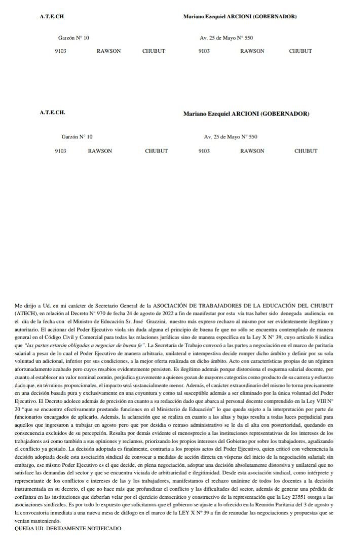 Me dirijo a Ud. en mi carácter de Secretario General de la ASOCIACIÓN DE TRABAJADORES DE LA EDUCACIÓN DEL CHUBUT (ATECH), en relación al Decreto N° 970 de fecha 24 de agosto de 2022 a fin de manifestar por esta vía tras haber sido denegada audiencia en el día de la fecha con el Ministro de Educación Sr. José Grazzini, nuestro más expreso rechazo al mismo por ser evidentemente ilegítimo y autoritario. El accionar del Poder Ejecutivo viola sin duda alguna el principio de buena fe que no sólo se encuentra contemplado de manera general en el Código Civil y Comercial para todas las relaciones jurídicas sino de manera específica en la Ley X N° 39, cuyo artículo 8 indica que “las partes estarán obligadas a negociar de buena fe”. La Secretaría de Trabajo convocó a las partes a negociación en el marco de paritaria salarial a pesar de lo cual el Poder Ejecutivo de manera arbitraria, unilateral e intempestiva decide romper dicho ámbito y definir por su sola voluntad un adicional, inferior por sus condiciones, a la mejor oferta realizada en dicho ámbito. Acto con características propias de un régimen afortunadamente acabado pero cuyos resabios evidentemente persisten. Es ilegítimo además porque distorsiona el esquema salarial docente, por cuanto al establecer un valor nominal común, perjudica gravemente a quienes gozan de mayores categorías como producto de su carrera y esfuerzo dado que, en términos proporcionales, el impacto será sustancialmente menor. Además, el carácter extraordinario del mismo lo torna precisamente en una decisión basada pura y exclusivamente en una coyuntura y como tal susceptible además a ser eliminado por la única voluntad del Poder Ejecutivo. El Decreto adolece además de precisión en cuanto a su redacción dado que abarca al personal docente comprendido en la Ley VIII N° 20 “que se encuentre efectivamente prestando funciones en el Ministerio de Educación” lo que queda sujeto a la interpretación por parte de funcionarios encargados de aplicarlo. Además, la aclaración que se realiza en cuanto a las altas y bajas resulta a todas luces perjudicial para aquellos que ingresaron a trabajar en agosto pero que por desidia o retraso administrativo se le da el alta con posterioridad, quedando en consecuencia excluidos de su percepción. Resulta por demás evidente el menosprecio a las instituciones representativas de los intereses de los trabajadores así como también a sus opiniones y reclamos, priorizando los propios intereses del Gobierno por sobre los trabajadores, agudizando el conflicto ya gestado. La decisión adoptada es finalmente, contraria a los propios actos del Poder Ejecutivo, quien criticó con vehemencia la decisión adoptada desde esta asociación sindical de convocar a medidas de acción directa en vísperas del inicio de la negociación salarial; sin embargo, ese mismo Poder Ejecutivo es el que decide, en plena negociación, adoptar una decisión absolutamente distorsiva y unilateral que no satisface las demandas del sector y que se encuentra viciada de arbitrariedad e ilegitimidad. Desde esta asociación sindical, como intérprete y representante de los conflictos e intereses de las y los trabajadores, manifestamos el rechazo unánime de todos los docentes a la decisión instrumentada en su decreto, el que no hace más que profundizar el conflicto y las dificultades del sector, además de generar una pérdida de confianza en las instituciones que deberían velar por el ejercicio democrático y constructivo de la representación que la Ley 23551 otorga a las asociaciones sindicales. Es por todo lo expuesto que solicitamos que el gobierno se ajuste a lo ofrecido en la Reunión Paritaria del 3 de agosto y la convocatoria inmediata a una nueva mesa de diálogo en el marco de la LEY X Nº 39 a fin de reanudar las negociaciones y propuestas que se venían manteniendo.