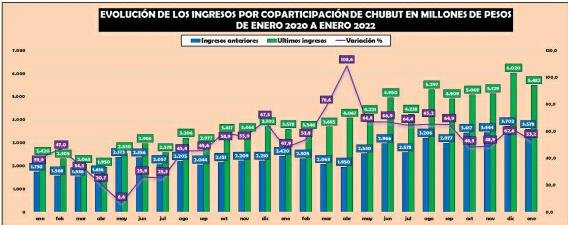 Durante enero pasado por Coparticipación Chubut cobró 5.482 millones de pesos, una cifra que superó en el 53,2% a los 3.578 millones que había percibido en el mismo mes del año pasado. Esa variación positiva representó la sumatoria de 1.903 millones de pesos.
