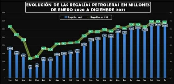 Para terminar de observar el aumento recaudatorio por regalías se debe considerar que en el 2021 el promedio mensual cobrado fue de 31,3 millones de dólares; mientras que en el 2020 había sido de 21,2 millones y en el 2019 -último año pre pandemia- fue de 30,6 millones de dólares.