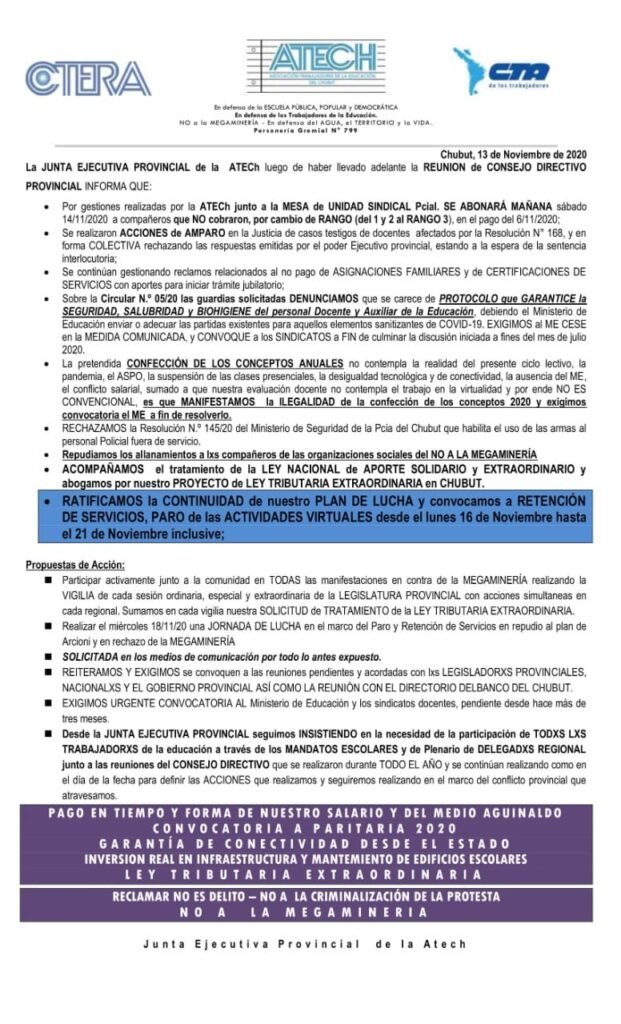 A partir de la exigencia de la ATECh, junto a los Sindicatos de la Mesa de Unidad Sindical, hemos logrado que el Gobierno de Chubut deposite hoy viernes 13/11/2020 el salario del mes de septiembre a lxs Trabajadorxs que pasaron del Rango 1 y 2 al Rango 3.