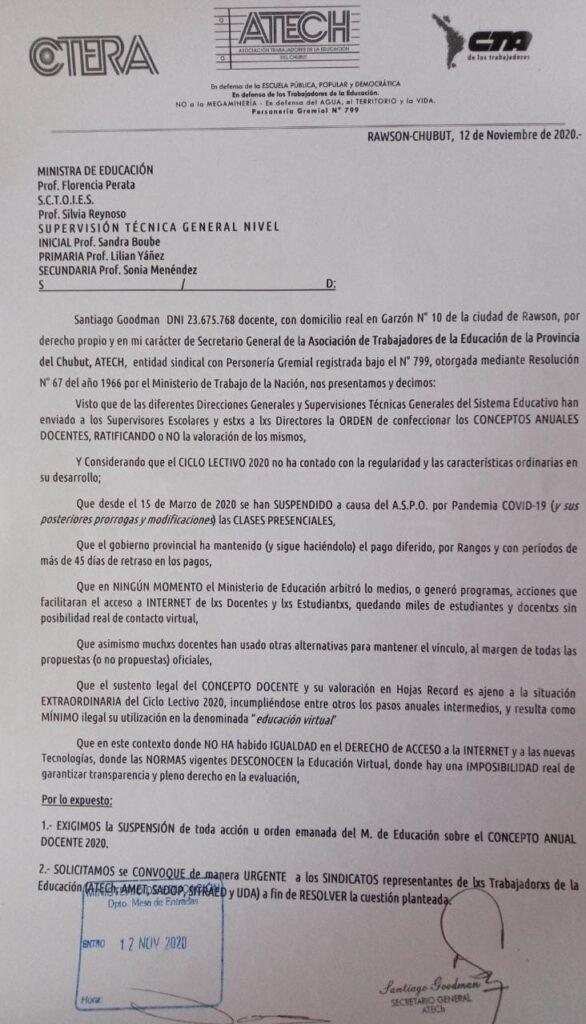 Presentación sobre la realización de los conceptos docentes en el marco de este año atravesado por la pandemia y los conflictos con el gobierno de la Provincia del Chubut.