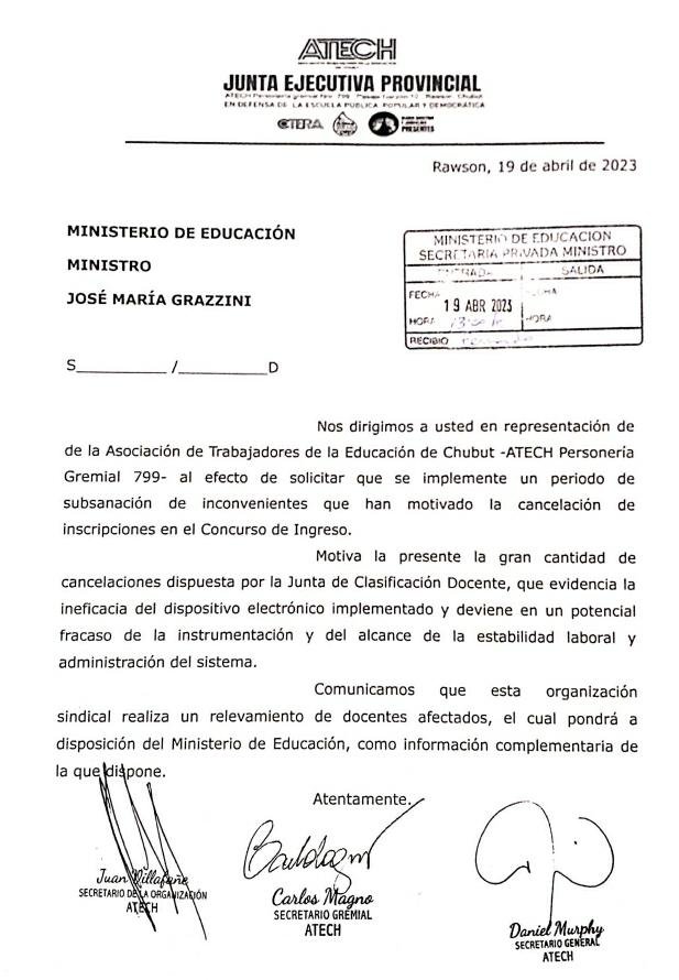 La Asociación de Trabajadores de la Educación de Chubut (ATECH) solicitó al ministerio de educación que se implemente un periodo de subsanación de inconvenientes que motivaron la cancelación de inscripciones en el Concurso de Ingreso.