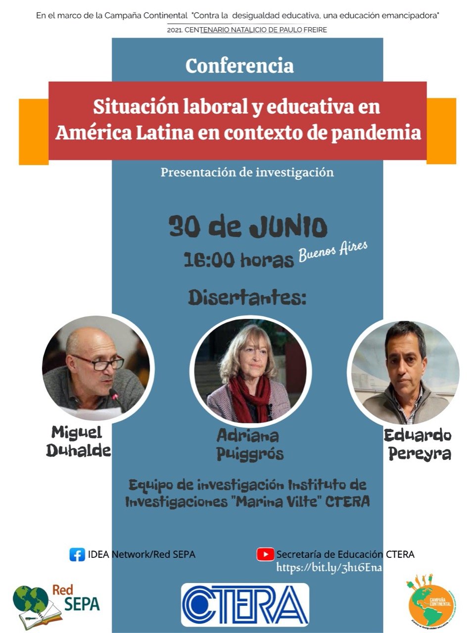 Disertarán Adriana Puiggrós, Miguel Duhalde y Eduardo Pereyra, y se podrá ver a través del canal de YouTube de la Secretaría de Educación de CTERA: Click aquí para ir.