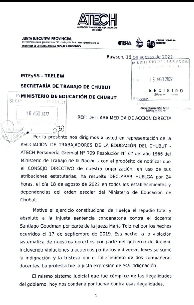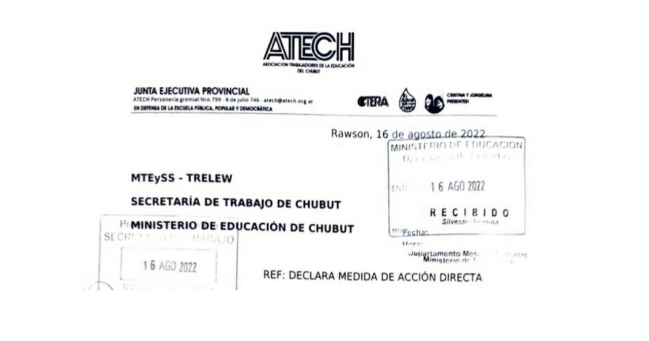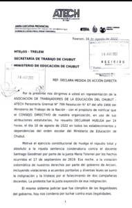 🔴 El CONSEJO DIRECTIVO DE ATECH, en uso de sus atribuciones estatutarias, ha resuelto DECLARAR HUELGA por 24 horas, el día 18 de agosto de 2022 en todos los establecimientos y dependencias del orden escolar del Ministerio de Educación de Chubut.