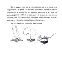 Por estas razones reclamamos la absolución de Santiago Goodman y el cese del espionaje policial ventilado en este juicio y la persecución judicial que sufrimos junto a otros militantes sindicales, de movimientos sociales, antimineros y de comunidades Mapuche Tehuelches.