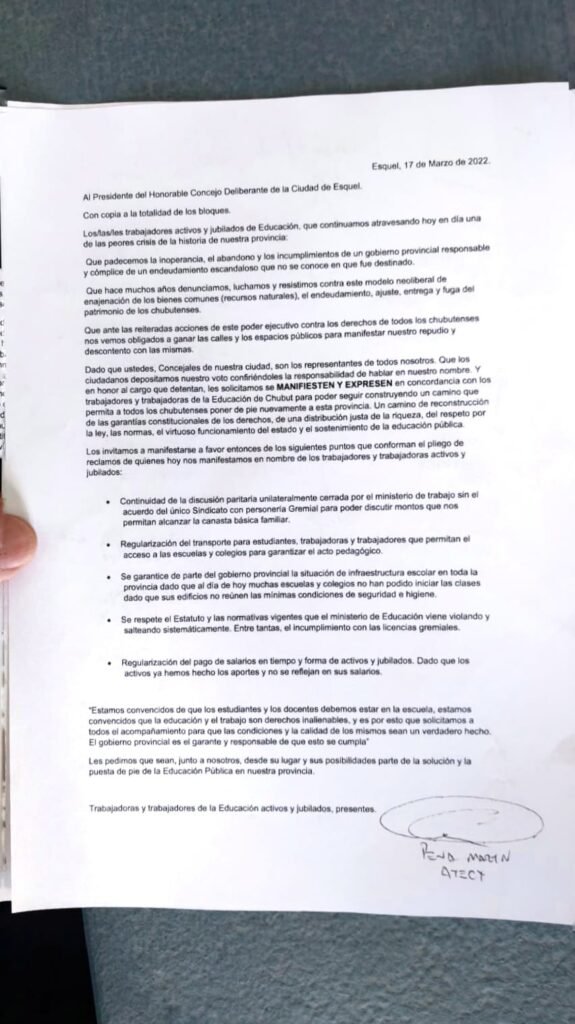 Se reunió en las puertas del Municipio de Comodoro Rivadavia y luego fue al Concejo Deliberante y entregó un petitorio a Concejales de la ciudad: Exigimos que también se hagan cargo de la realidad salarial y de infraestructura que vivimos a diario.