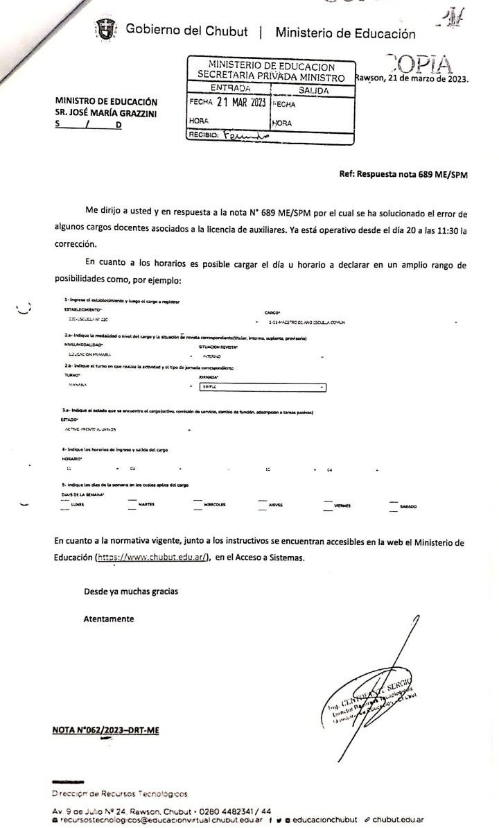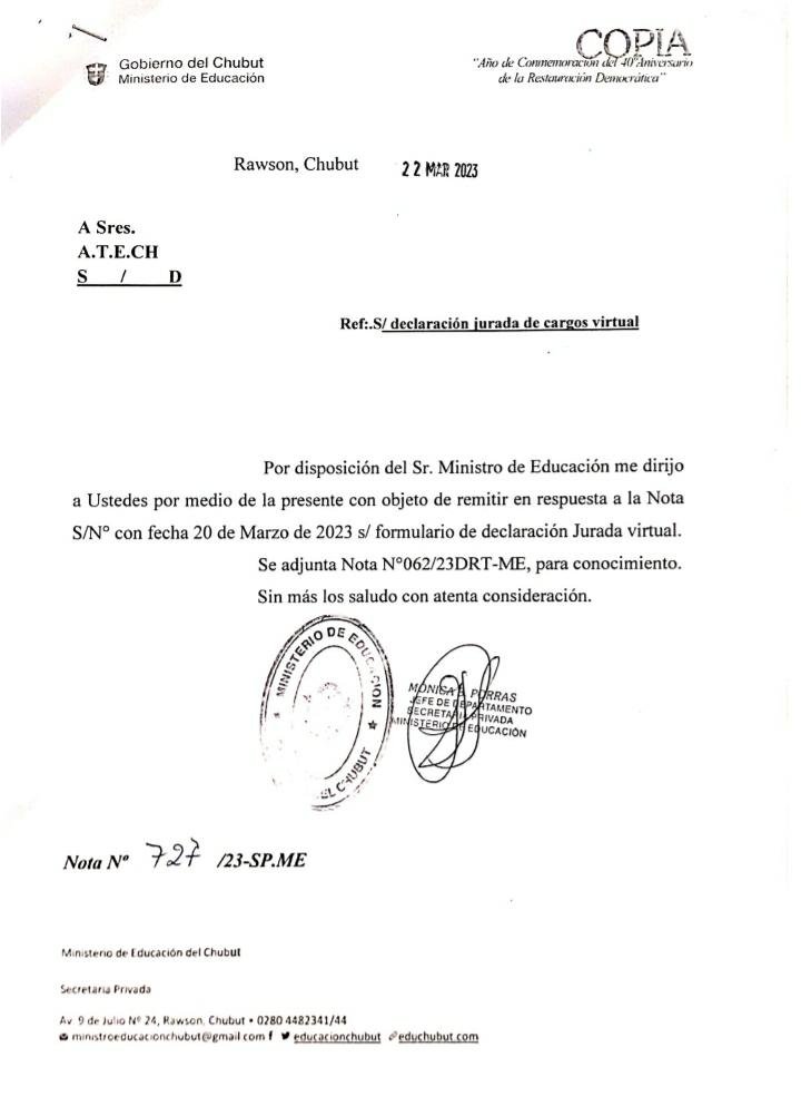 El Ministro de Educación de Chubut responde al pedido de ATECH de resolver algunos problemas en relación al formulario DDJJ virtual. (Lee el pedido realizado: https://atech2025.altaweb.net/atech-solicito-soluciones-ante-problemas-con-relacion-al-formulario-ddjj-virtual/)