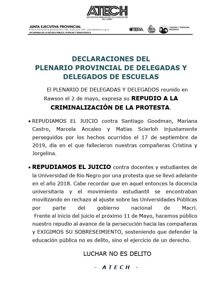 El PLENARIO DE DELEGADAS Y DELEGADOS reunido en Rawson el 2 de mayo, expresa su REPUDIO A LA CRIMINALIZACIÓN DE LA PROTESTA.