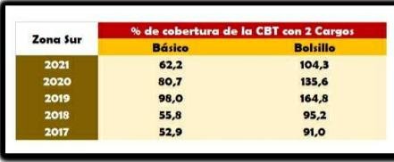 Es decir que un docente con dos cargos consigue cobrar a fin de mes 80.308 pesos en la Zona Norte y 88.825 pesos en la Zona Sur; mientras que la Canasta Básica Total (CBT) medida en Comodoro Rivadavia -según los últimos datos informados por el Observatorio de Economía de la Facultad de Ciencias Económicas de la Universidad Nacional de la Patagonia San Juan Bosco, que integra el profesor y economista César Herrera- rondaba a finales del año pasado los 85.173 pesos.
