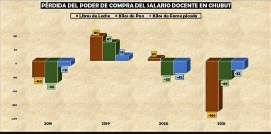 En el 2021 el sueldo de un docente de Chubut pudo comprar en 189 litros de leche menos que en el 2019, 68 kilos menos de pan francés o 32 kilos de carne picada a los que ya no pueden acceder con el salario de bolsillo. Así de grave y contundente es la depreciación salarial producida en estos dos últimos años.