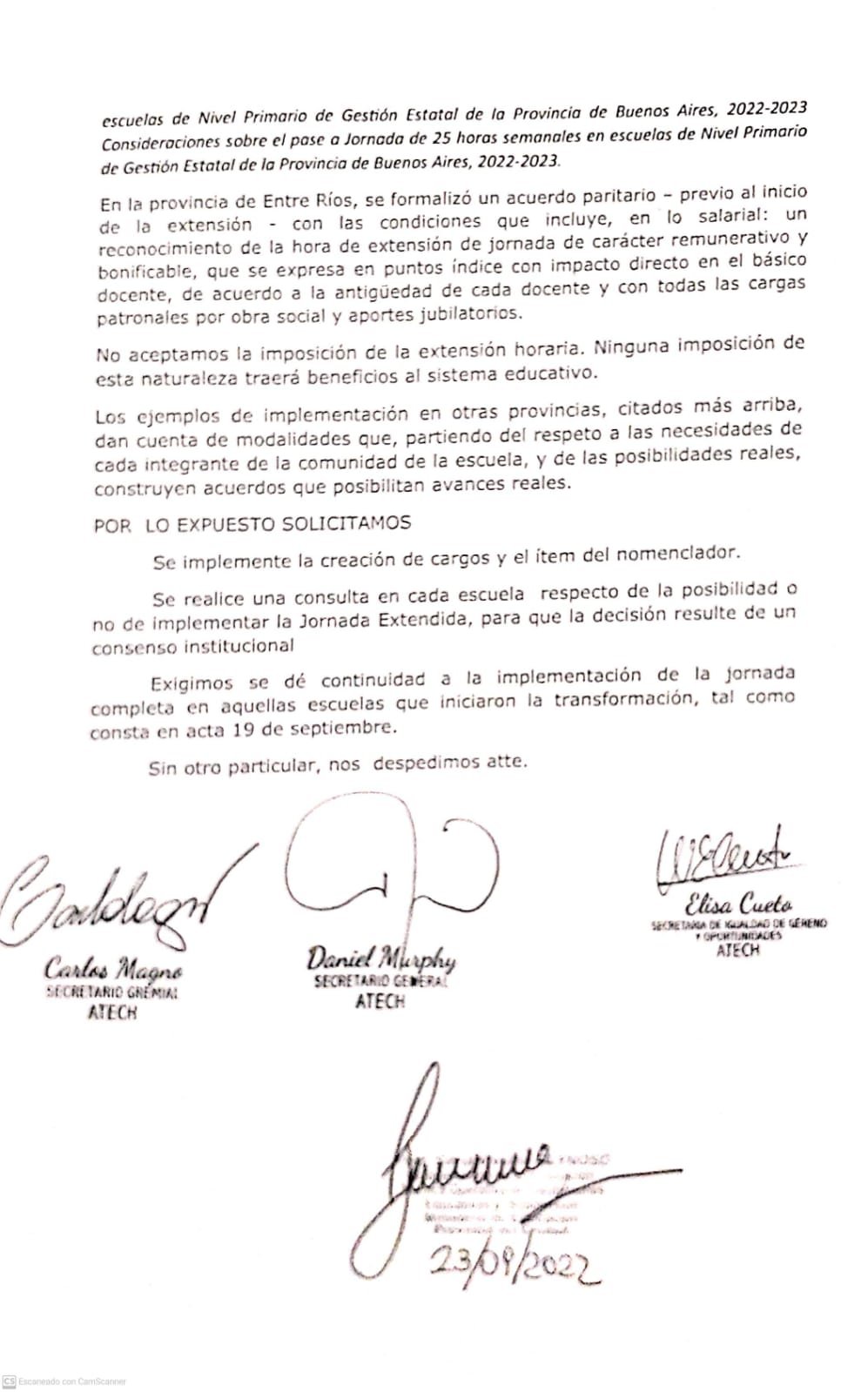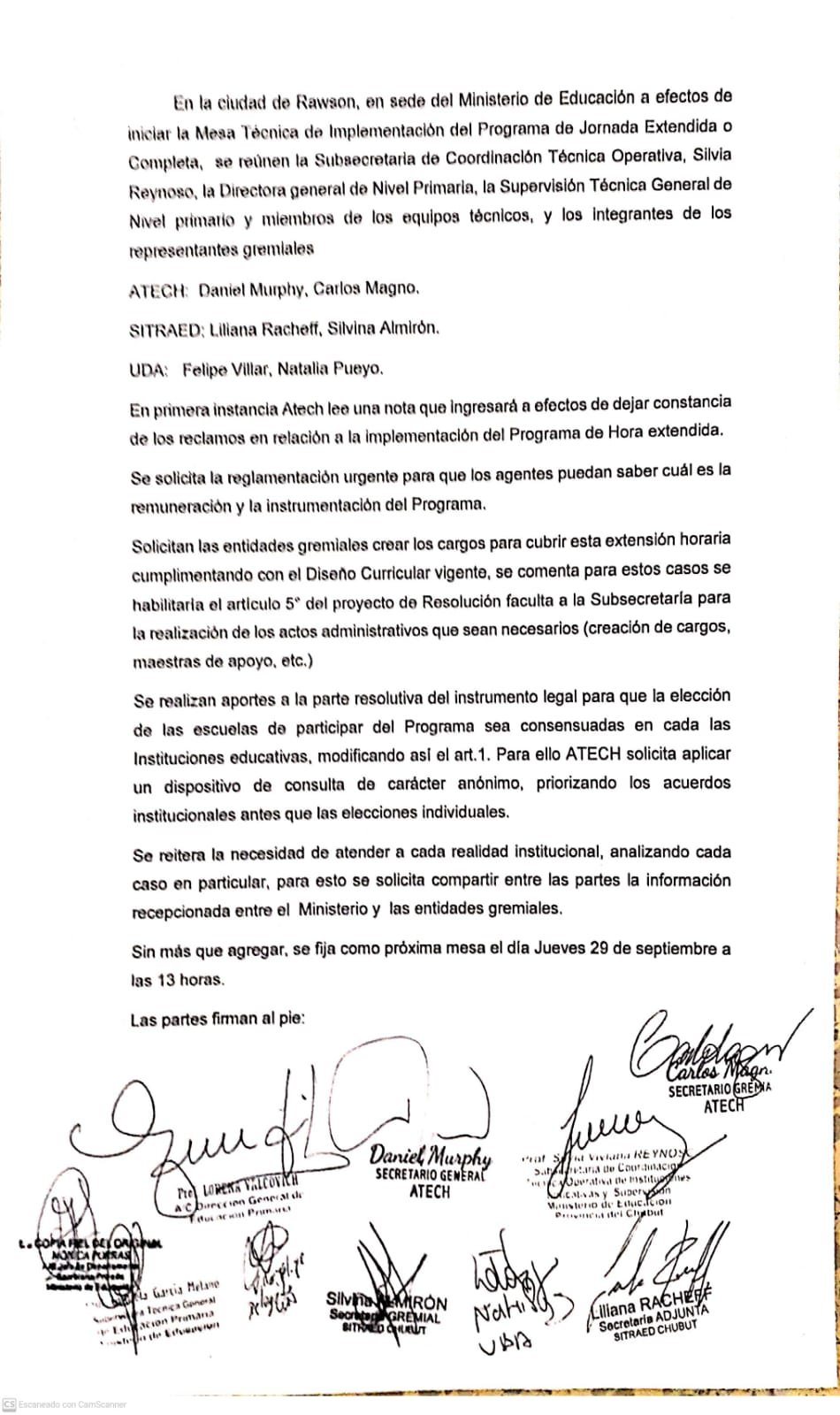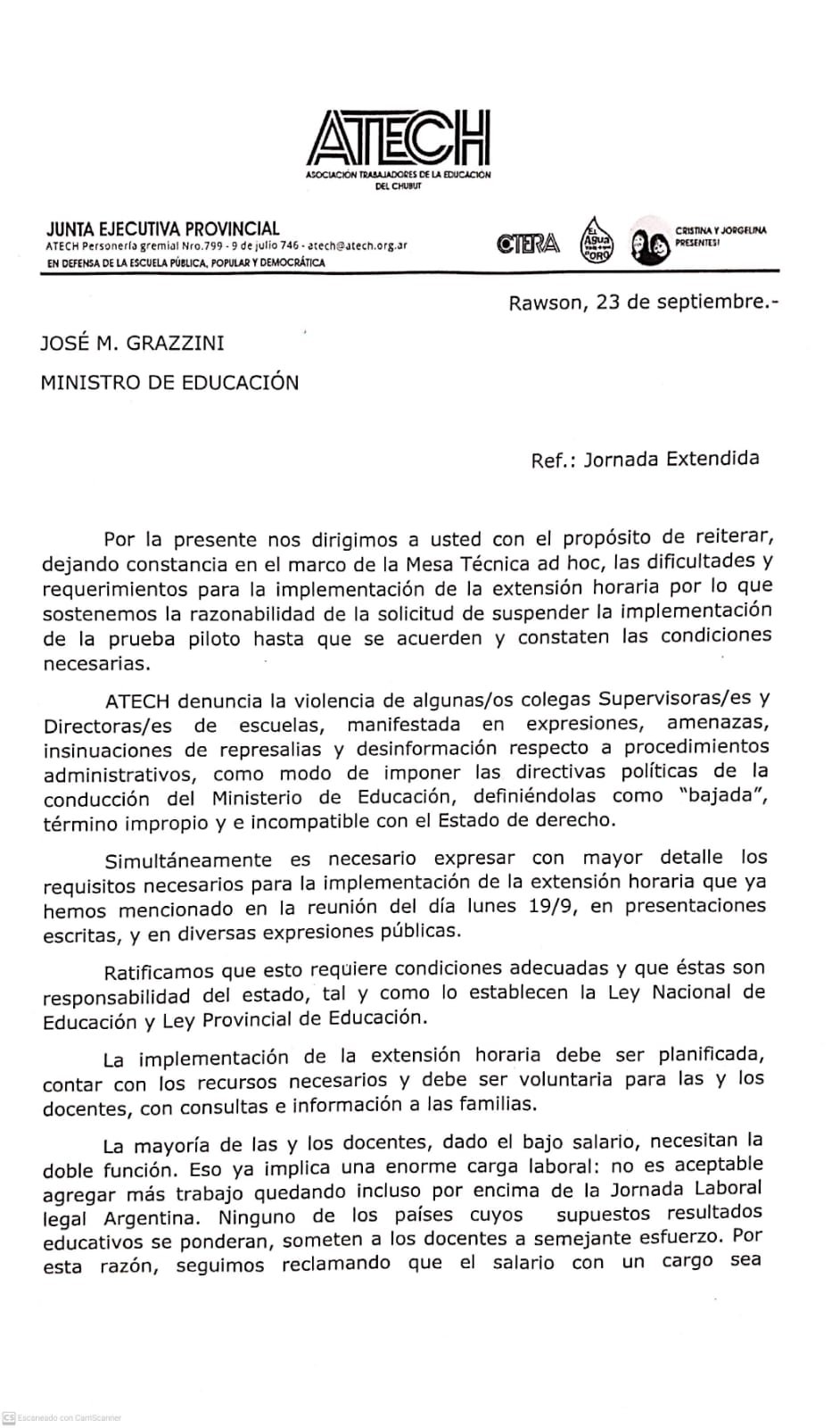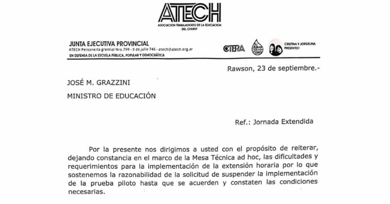 La Junta Ejecutiva Provincial de ATECH se dirigió al Ministro de Educación, José Grazzini con el propósito de reiterar, dejando constancia en el marco de la Mesa Técnica, las dificultades y requerimientos para la implementación de la extensión horaria, sosteniendo la solicitud de suspender la implementación de la prueba piloto hasta que se acuerden y constaten las condiciones necesarias.