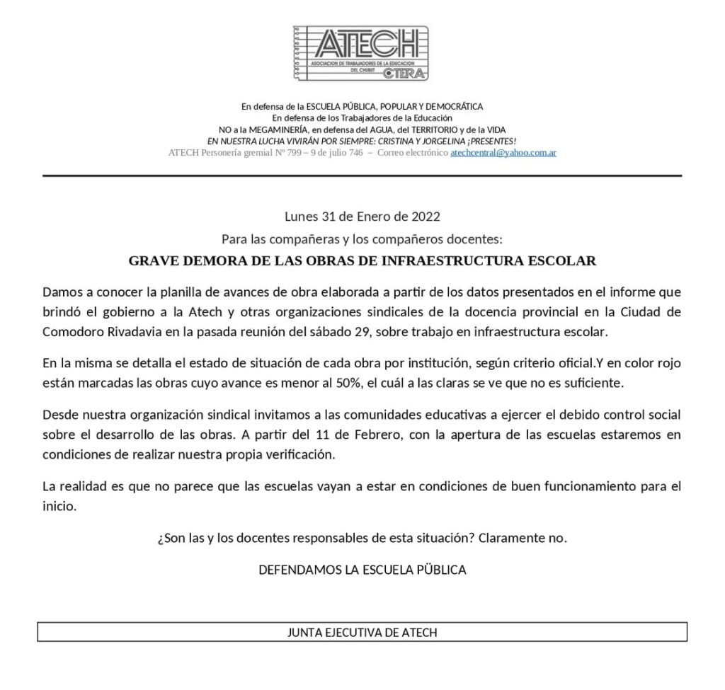 Desde nuestra organización sindical invitamos a las comunidades educativas que ejercer el debido control social sobre el desarrollo de las obras. A partir de 11 de febrero, con la apertura de las escuelas estaremos en condiciones de realizar nuestra propia verificación.