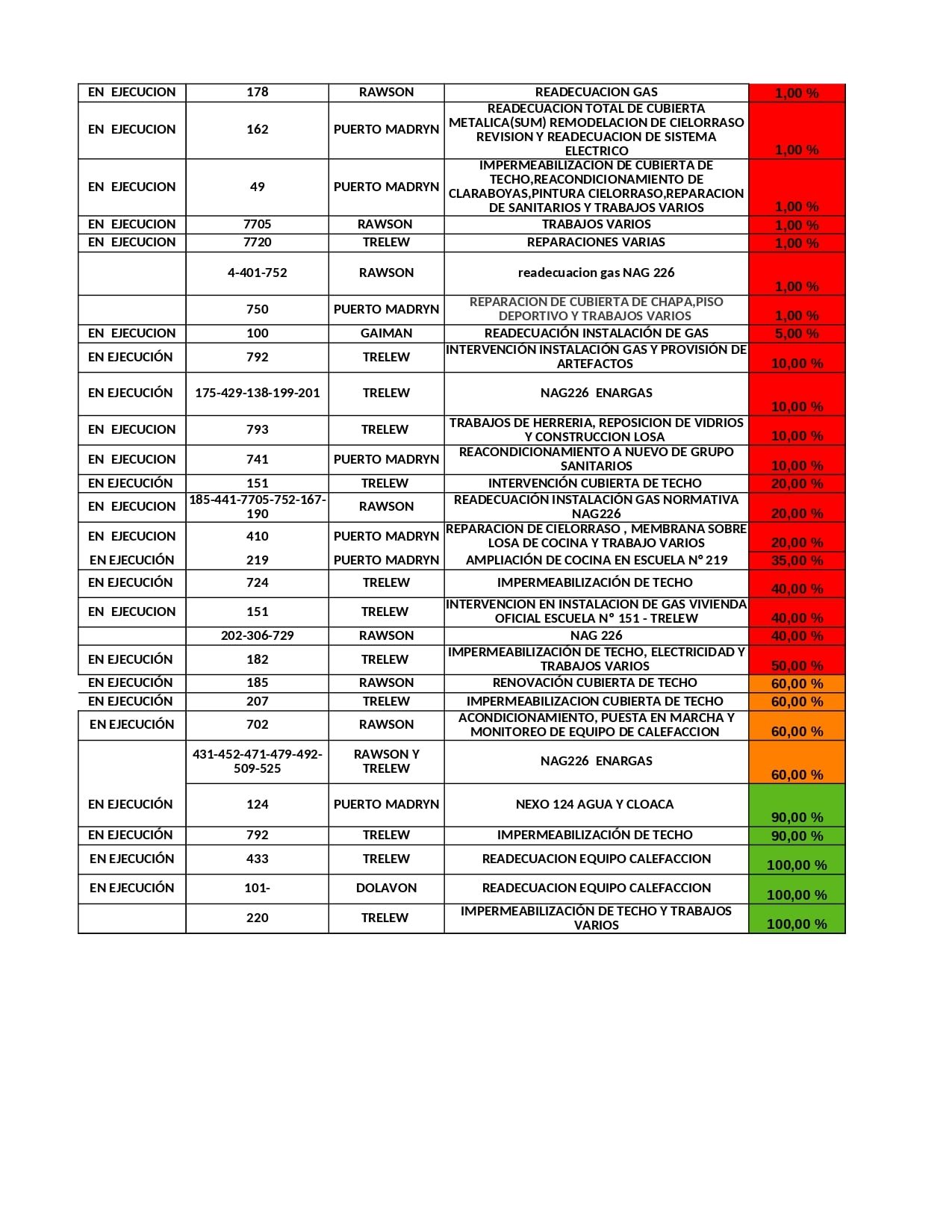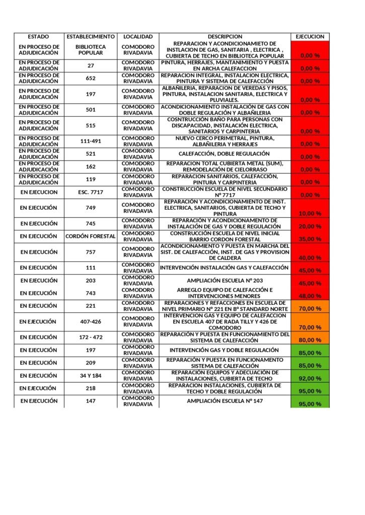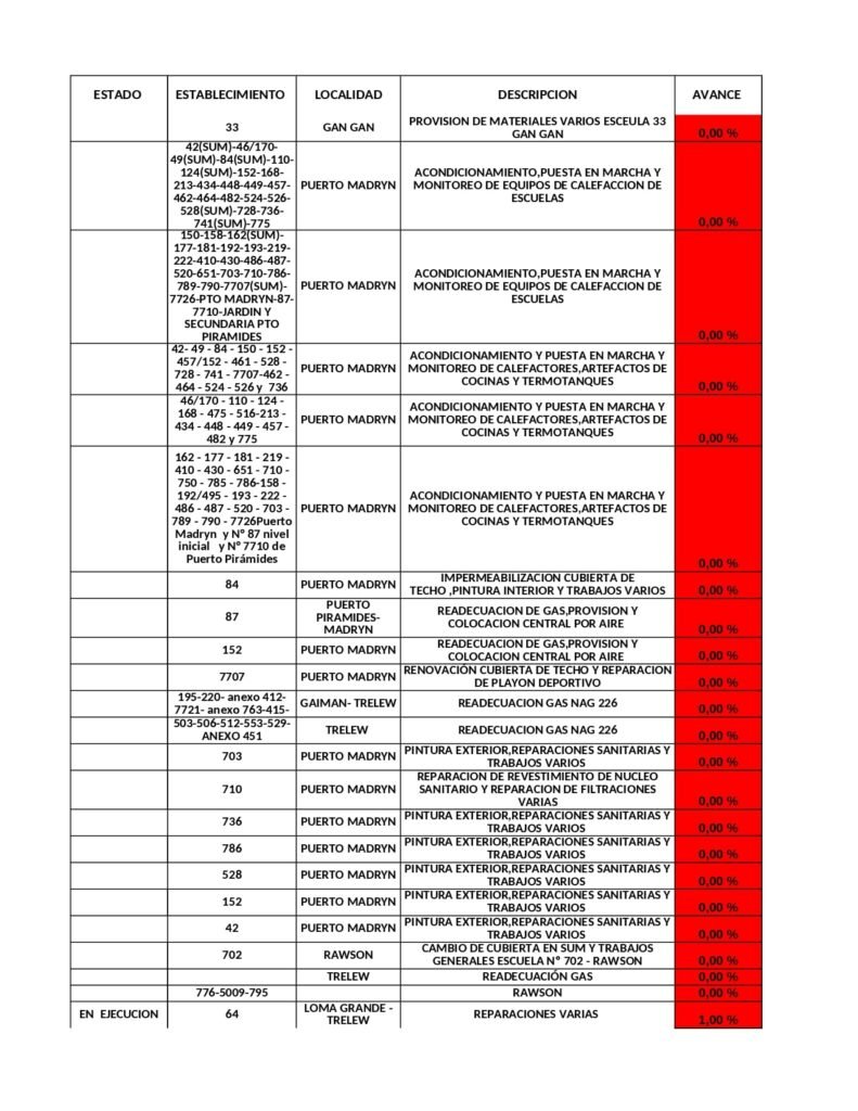En la misma se detalla el estado de situación de cada obra por institución, según el criterio oficial. Y en color rojo están marcadas las obras cuyos avance es menor al 50%. Claramente se ve que no es suficiente.