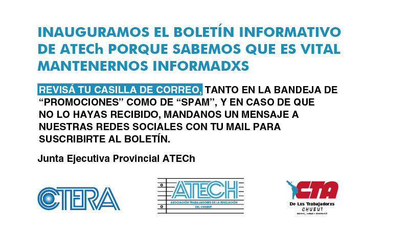 Somos la Junta Ejecutiva Provincial de la ATECh Chubut y te contamos que estamos inaugurando este nuevo canal de comunicación para el sindicato, porque sabemos que es vital mantenernos informadxs. Es por eso que enviaremos semanalmente diferentes correos electrónicos con información importante que atañe al gremio.