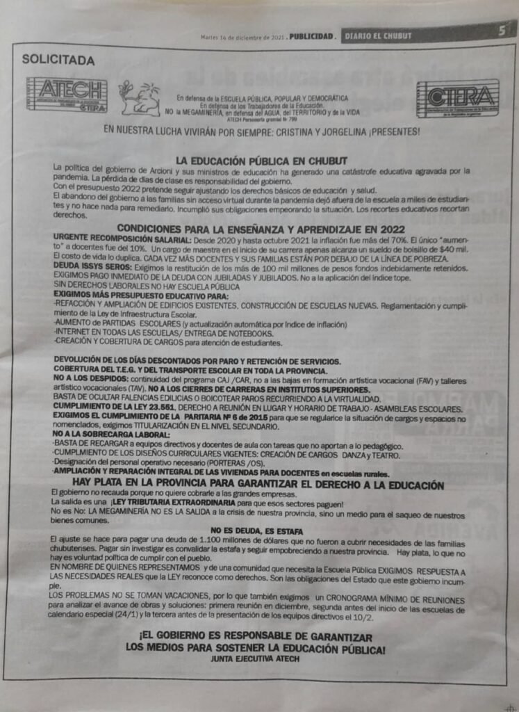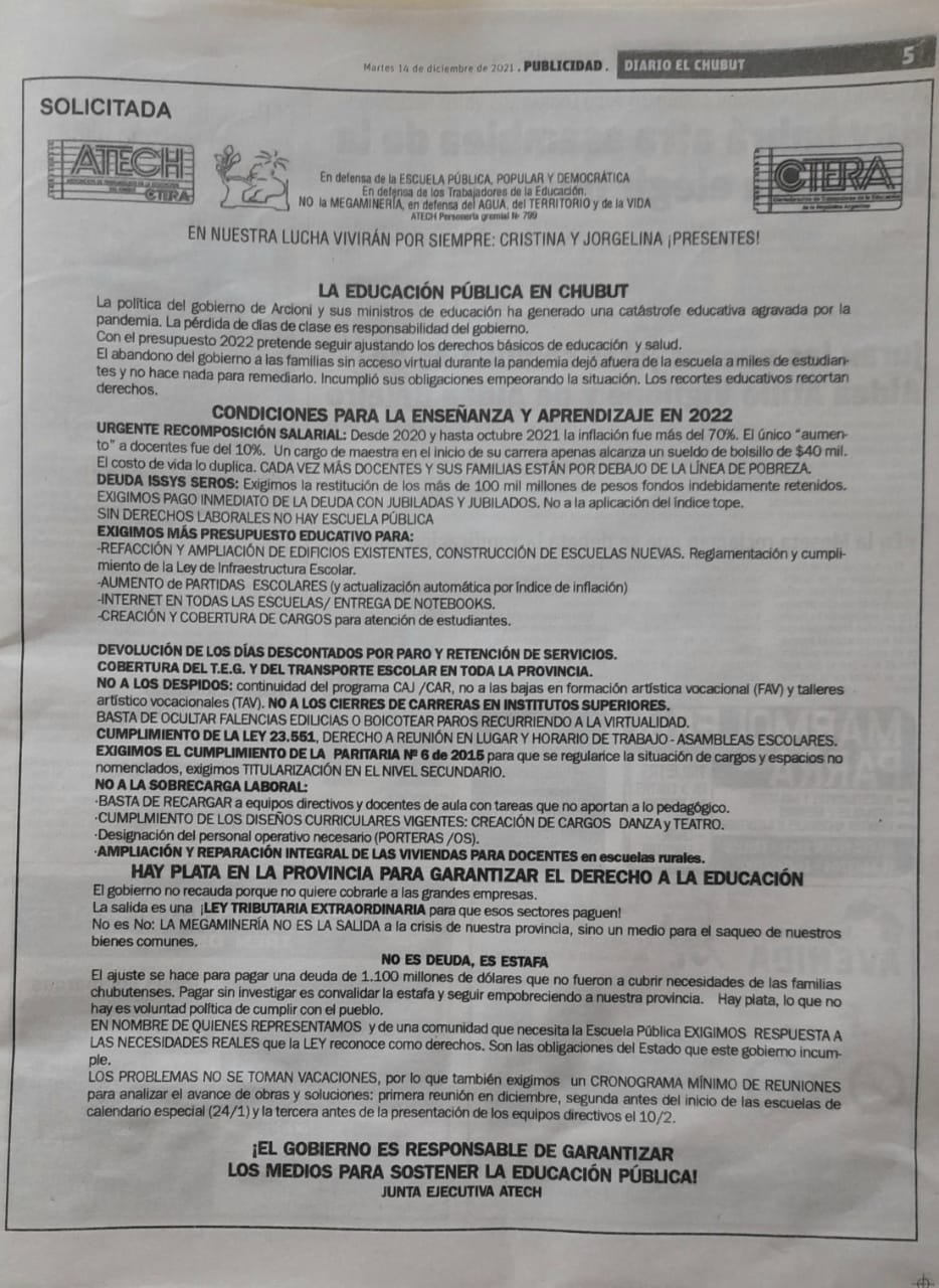 La Junta Ejecutiva de ATECh emitió un comunicado para pedir al Gobierno de Chubut que se garantice el derecho a la educación. Solicitan la recomposición salarial, el pago de la deuda ISSyS Seros, más presupuesto para la educación, devolución de los días descontados por paro y retención de servicios, cobertura del T.E.G y trasporte en toda la provincia, entre otros puntos.
