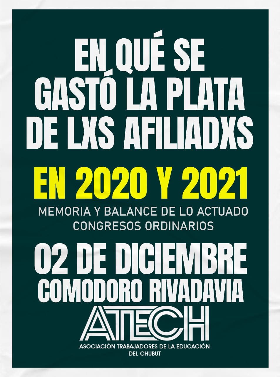 Este viernes 02 de diciembre del 2022 en la sede de ATECH Regional Sur de Comodoro Rivadavia se realizarán los Congresos Ordinarios 2020 – 2021.