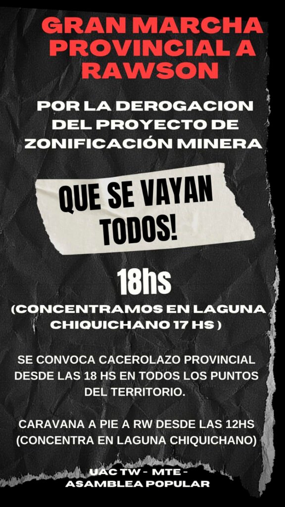 Por este motivo la asamblea contra la megaminería y en defensa del agua de Trelew convocó a una marcha provincial a Rawson para este jueves por la tarde. Participaran vecinos de otras localidades del valle. Desde la mañana hay vecinos manifestándose en la Capital, frente a Casa de Gobierno.