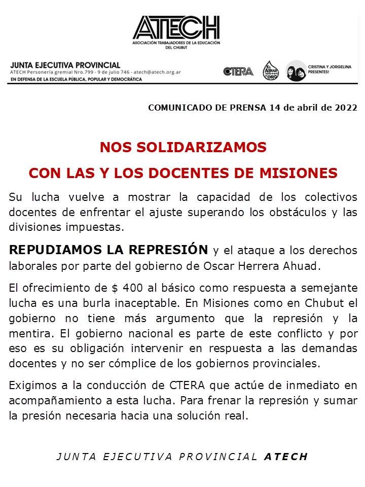 El ofrecimiento de $ 400 al básico como respuesta a semejante lucha es una burla inaceptable. En Misiones como en Chubut el gobierno no tiene más argumento que la represión y la mentira. El gobierno nacional es parte de este conflicto y por eso es su obligación intervenir en respuesta a las demandas docentes y no ser cómplice de los gobiernos provinciales.