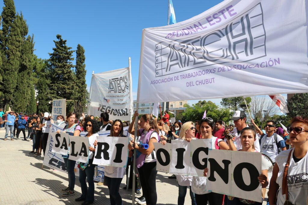 El miércoles 2 de febrero del 2022 se llevó adelante el día 1 de paro. Docentes, no docentes y comunidad en general, se unieron al paro activo y se concentraron en la ciudad de Rawson – y en otros puntos de Chubut – para reclamar por un salario digno y defender la educación pública.