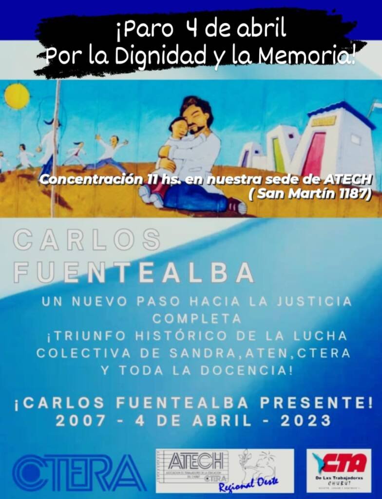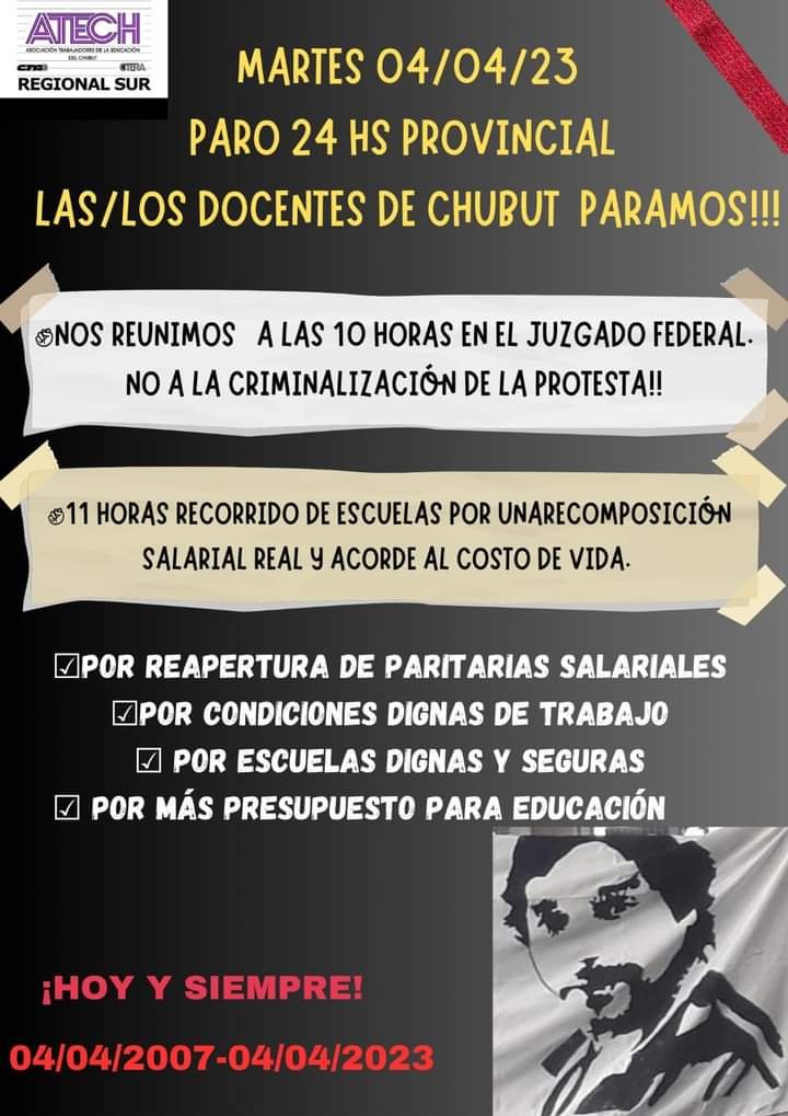 Este martes 04 de abril paramos todxs. Nos reunimos a las 8.30 hs en el Juzgado Federal de Rawson porque luchar por el agua no es delito. A las 11.00 nos concentramos al frente del Ministerio de Educación para exigir ¡Paritarias ya!