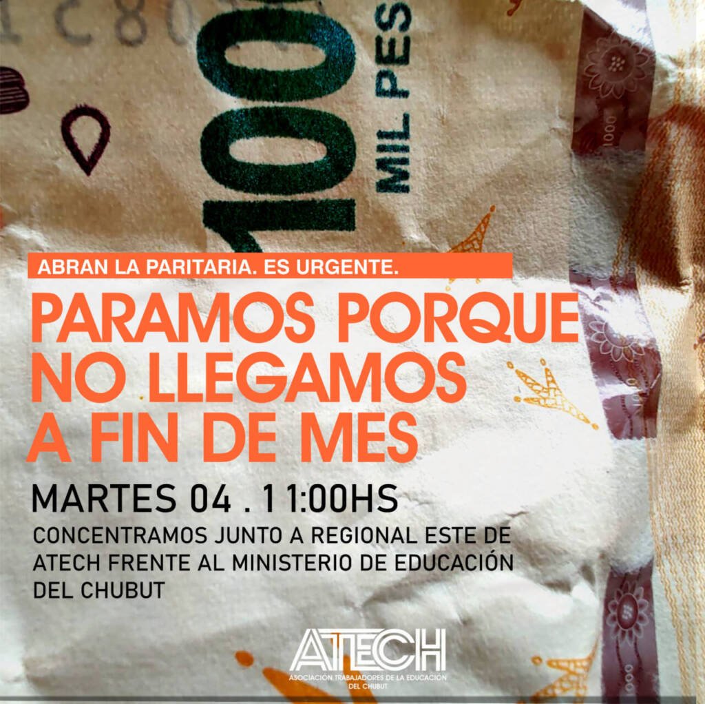 - MARTES 04 – 11.00 hs. concentramos junto a Regional Este frente al Ministerio de Educación del Chubut ¡PARITARIAS YA!
