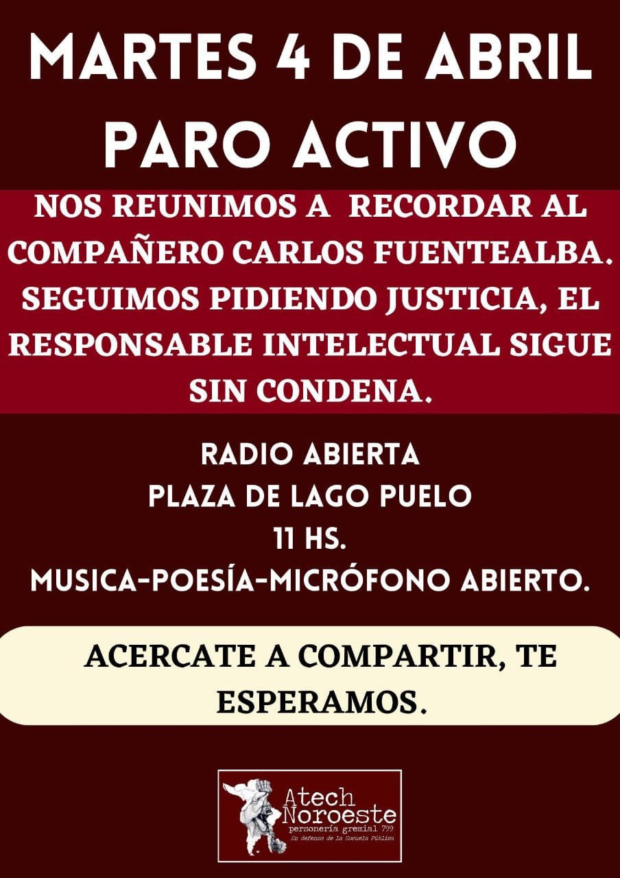 Este martes 04 de abril paramos todxs. Nos reunimos a las 8.30 hs en el Juzgado Federal de Rawson porque luchar por el agua no es delito. A las 11.00 nos concentramos al frente del Ministerio de Educación para exigir ¡Paritarias ya!