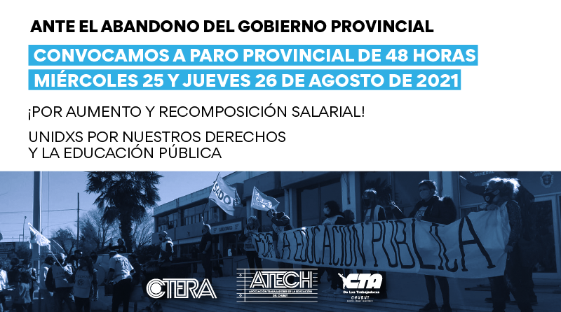 El Consejo Directivo Provincial de la ATECh resuelve por Mandatos Escolares, convocar a paro provincial de 48 horas los días miércoles 25 y jueves 26 de agosto de 2021.