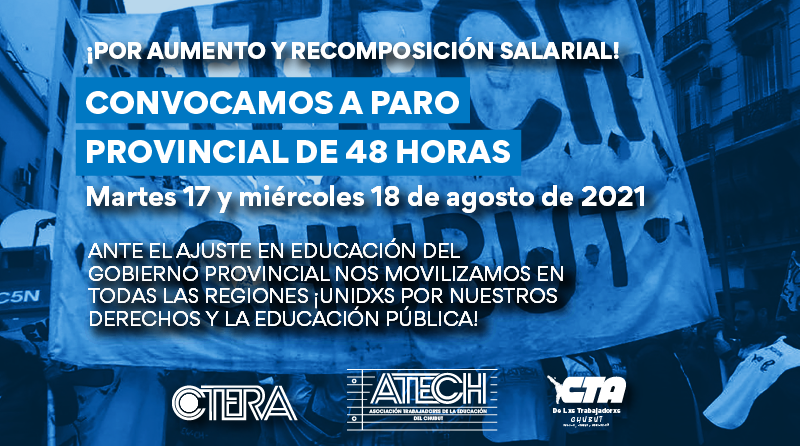 Por esta falta de respuesta por parte del gobierno provincial es que convocamos a paro provincial de 48 horas para todxs lxs trabajadorxs de la educación los días martes 17 y miércoles 18 de agosto de 2021.