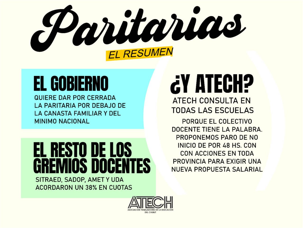 El gobierno, pretende cerrar una paritaria sin discusión en las escuelas. Nos opusimos y llamamos a que se exprese la opinión de cada docente. El acuerdo, con la firma de SITRAED, SADOP, AMET y UDA, de un 38% en cuotas no alcanza siquiera a cubrir la inflación.