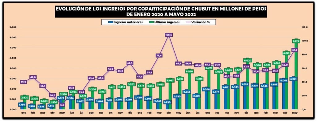 En cinco meses Chubut recaudó 18.438 millones de pesos más que en el mismo período del 2021, una cifra similar a dos masas salariales completas del mes de mayo.