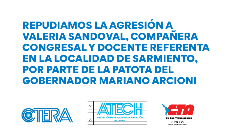 El Consejo Directivo de la ATECh repudia la agresión a nuestra compañera Valeria Sandoval, Congresal y docente referenta de la localidad de Sarmiento, por parte de la patota del gobernador Mariano Arcioni, cuando intentó pedirle explicaciones y respuestas sobre el ajuste en las escuelas y los veinte meses sin recomposición salarial que sufrimos en Chubut.