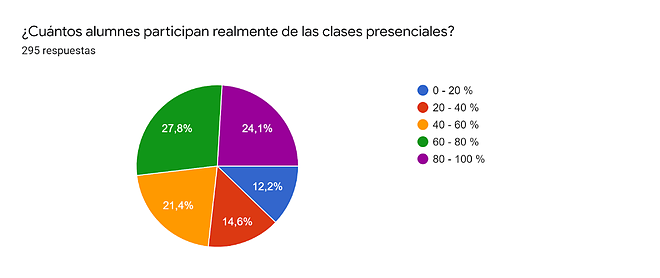 Ante la pregunta de la encuesta realizada por la Escuela de Formación Política Pedagógica y Sindical “Stella Maldonado”, sobre cuántxs alumnxs participan de la presencialidad, vemos que sólo el 24,1% concurre efectivamente a clase.