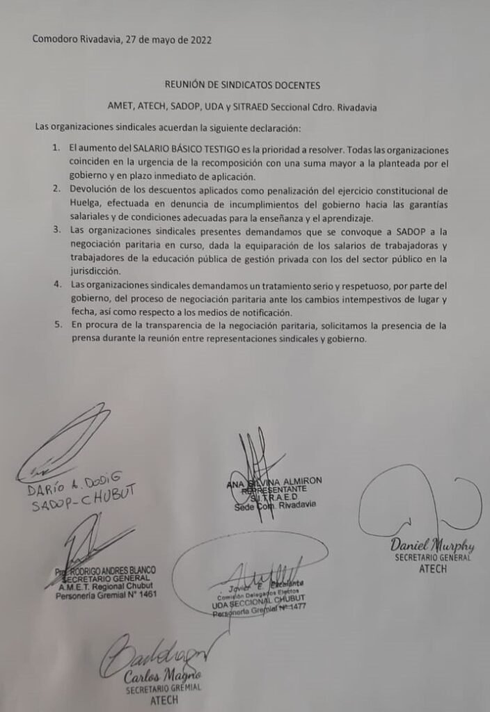 AMET, ATECH, SADOP, UDA y SITRAED Seccional Cdro. Rivadavia.