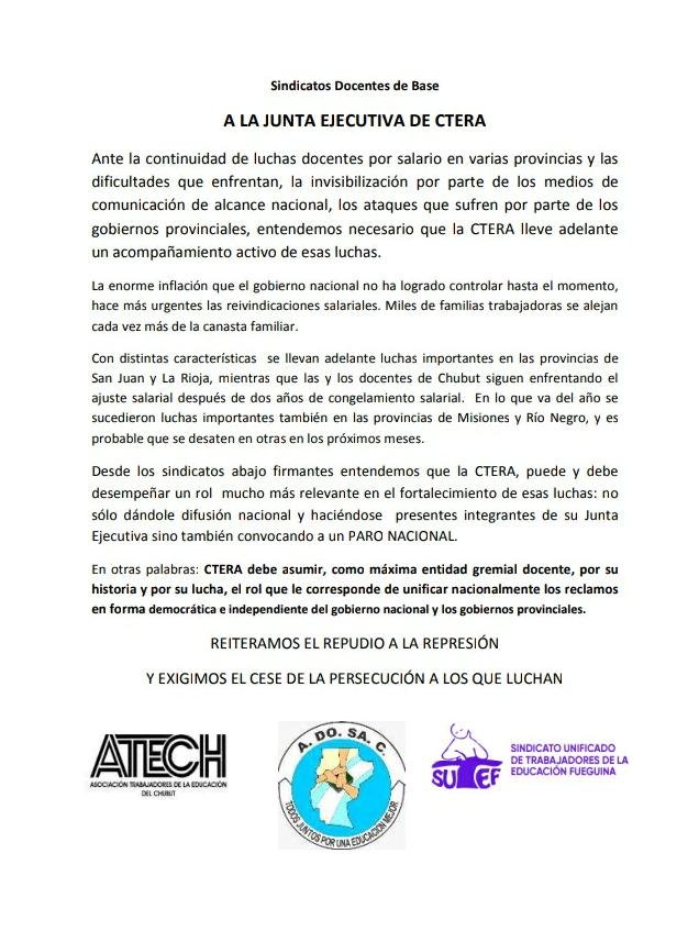 Desde los sindicatos abajo firmantes entendemos que la CTERA, puede y debe desempeñar un rol mucho más relevante en el fortalecimiento de esas luchas: no sólo dándole difusión nacional y haciéndose presentes integrantes de su Junta Ejecutiva sino también convocando a un PARO NACIONAL.