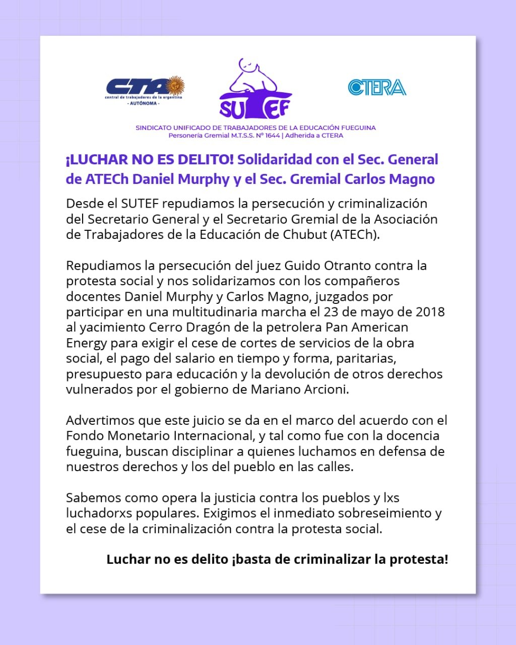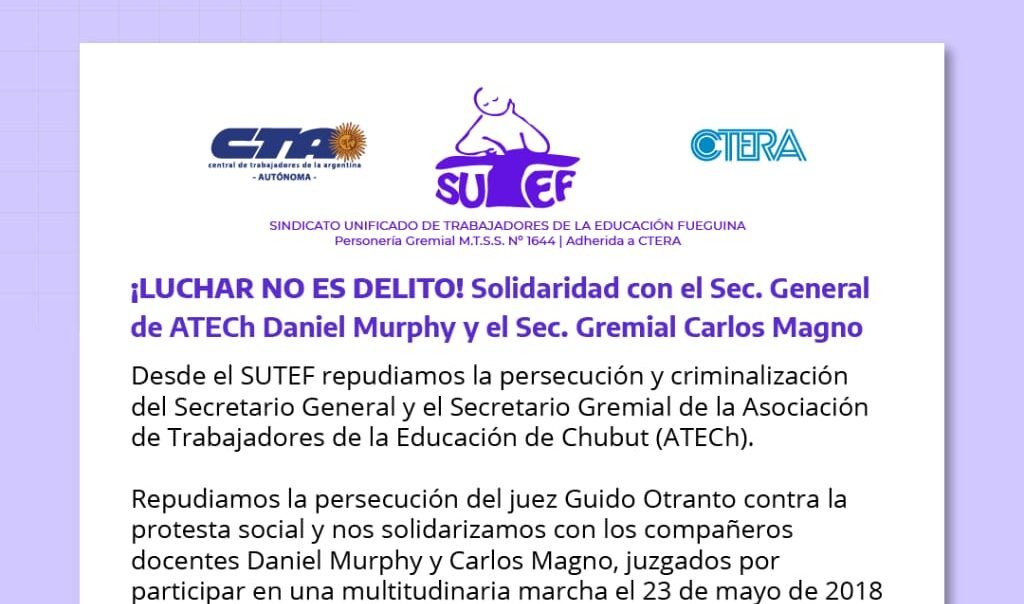 El Sindicato Unificado de Trabajadores de la Educación Fueguina (SUTEF) repudia la persecución del juez Guido Otranto contra la protesta social y se solidarizan con Daniel Murphy y Carlos Magno.